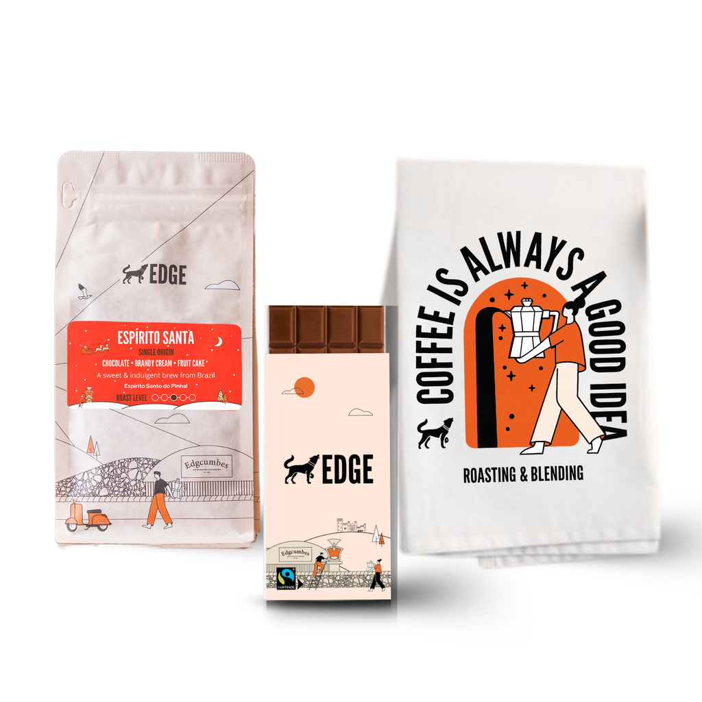 Our Cosy Moments Gift Set includes our festive Brazilian Christmas Coffee, a custom EDGE Chocolate Bar, and a Coffee Lovers Tea Towel — the perfect treat or thoughtful gift for any coffee lover this Christmas.
